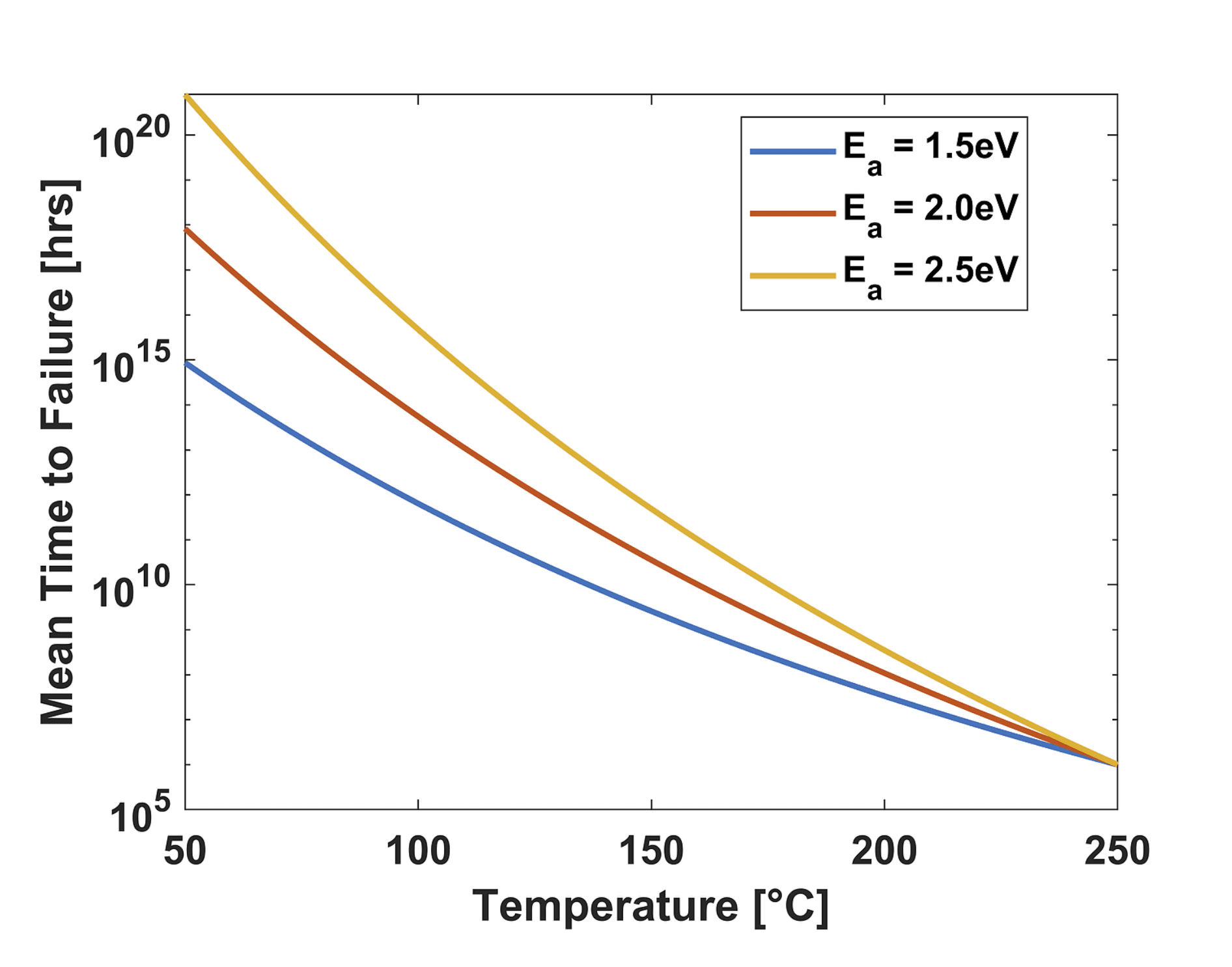 Let’s take a closer look at these variables. TTF_test is the lifetime of the device measured in an accelerated life test at temperature T_test. These parameters can usually be found from the manufacturer’s testing procedures, or can be based on a testing standard. The Boltzmann constant k_B is known since it is a physical constant, and T_operation is chosen by the device integrator. Therefore, the main parameter in this equation in determining the mean time to failure MTTF is the apparent activation energy E_a.
