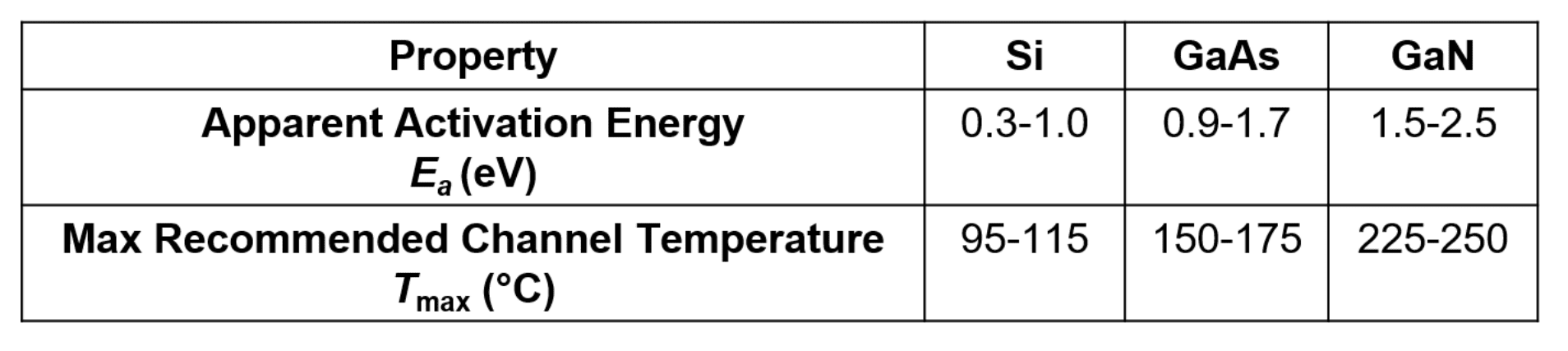 Another issue is that many of these failure mechanisms are also highly dependent on geometry and operational environment. Even for two devices that use the same material (e.g., GaN), it is hard to parse out a single consistent value for E_a. Two different device geometries, or even the same device operating under different conditions, can show different values of E_a depending on what the exact feature length scales are, how they are soldered or bonded, or what voltages and currents they see. So, the Arrhenius equation is only really valid for a given device operating in the same conditions as its test, and whose failure mechanism is due to an Arrhenius process. Generally speaking, that is pretty limited.