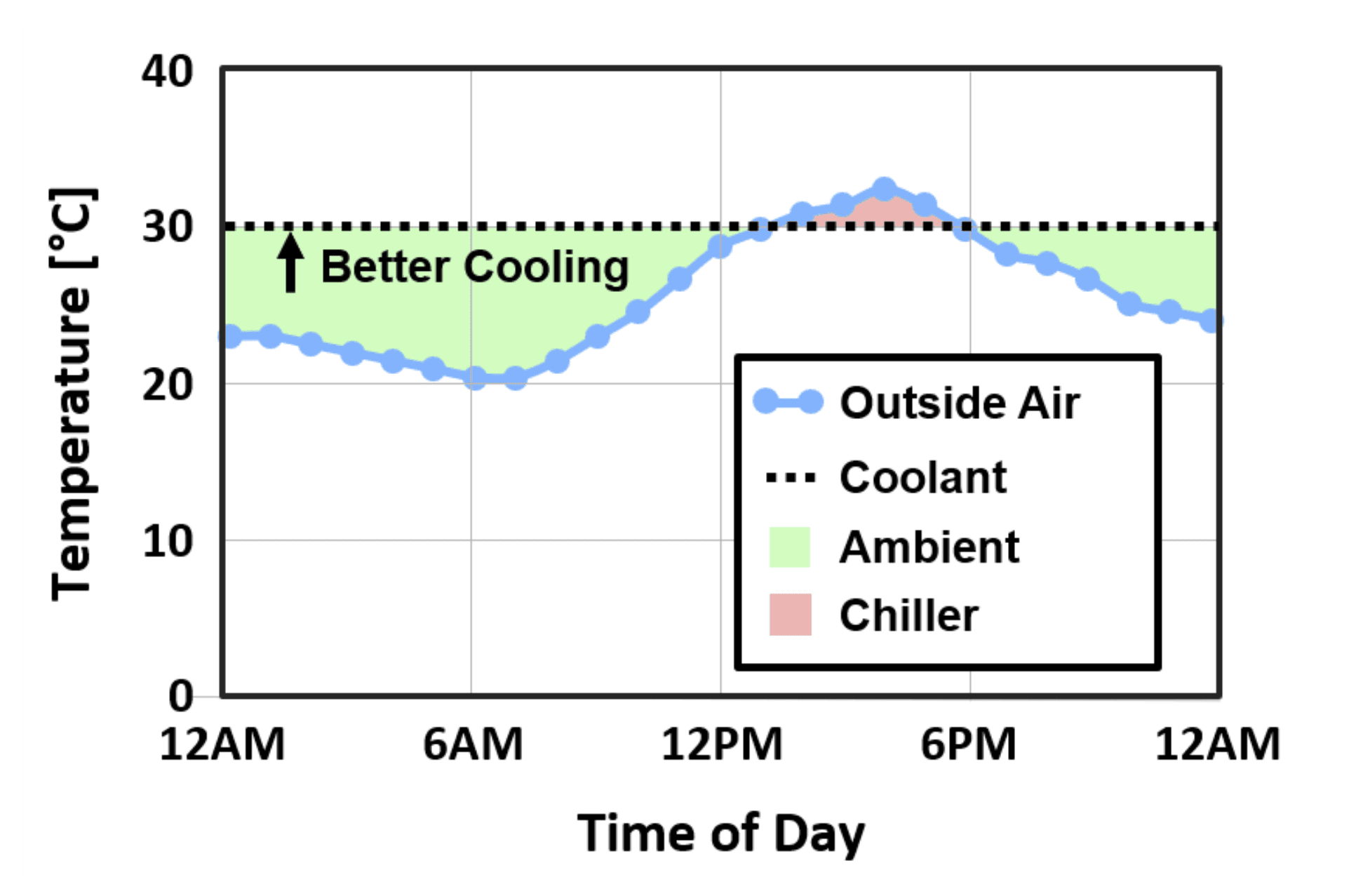 This is where the chiller enters. The chiller employs a refrigeration cycle to compress and expand a refrigerant to achieve sub-ambient temperatures in the coolant. While this is a very useful mechanism, powering the refrigeration cycle requires high energy usage, which calls for a less sustainable, more costly data center. Therefore, the goal is to minimize the amount of time the chiller needs to be used.