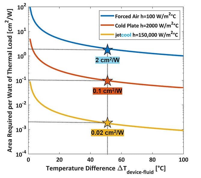 In the case of JetCool cooling, the cooling area required of 0.2cm^2 is actually smaller than the device footprint, which would allow for a cooling solution to be directly mounted within the extents of the device. This would allow very densely packed arrays of devices with no loss in performance. Alternatively, we could increase the device power density while keeping the cooling solution within the device footprint.