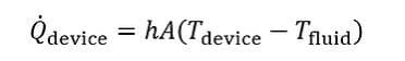 where Q_dot_device is the waste heat from the device (W), h is the heat transfer coefficient of the cooling method being applied (W/m^2°C), A is the area over which heat is being transferred (m^2), and T_device and T_fluid are the temperatures of the device and rejection fluid, respectively (°C). In this equation, the inherent cooling effectiveness is represented by h, as this corresponds to how well a given cooling method can remove heat for a given area and temperature difference.
