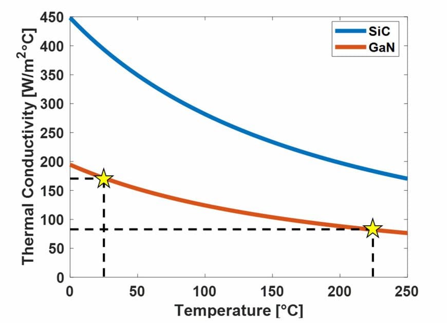 Unfortunately for device designers and engineers, the thermal conductivity drops as temperature increases (and not just a little!). This is what the dropoff looks like for GaN and SiC: