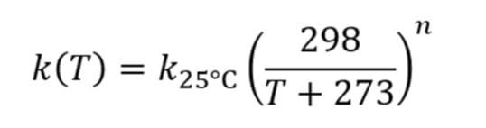 where k_25°C is the value of thermal conductivity at 25°C, T is the temperature in Celsius, and n is a fitted parameter denoting the temperature dependence. The values for these parameters can be found in the literature [1], copied here: