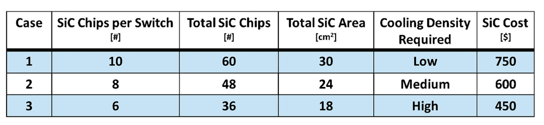 Table 1: Example cost savings table for a three-phase inverter (six transistor switches). Assumes 0.5 cm^2 SiC chips at a cost of $25/cm^2. The contents of this table are by no means universal and must be evaluated for each individual application.